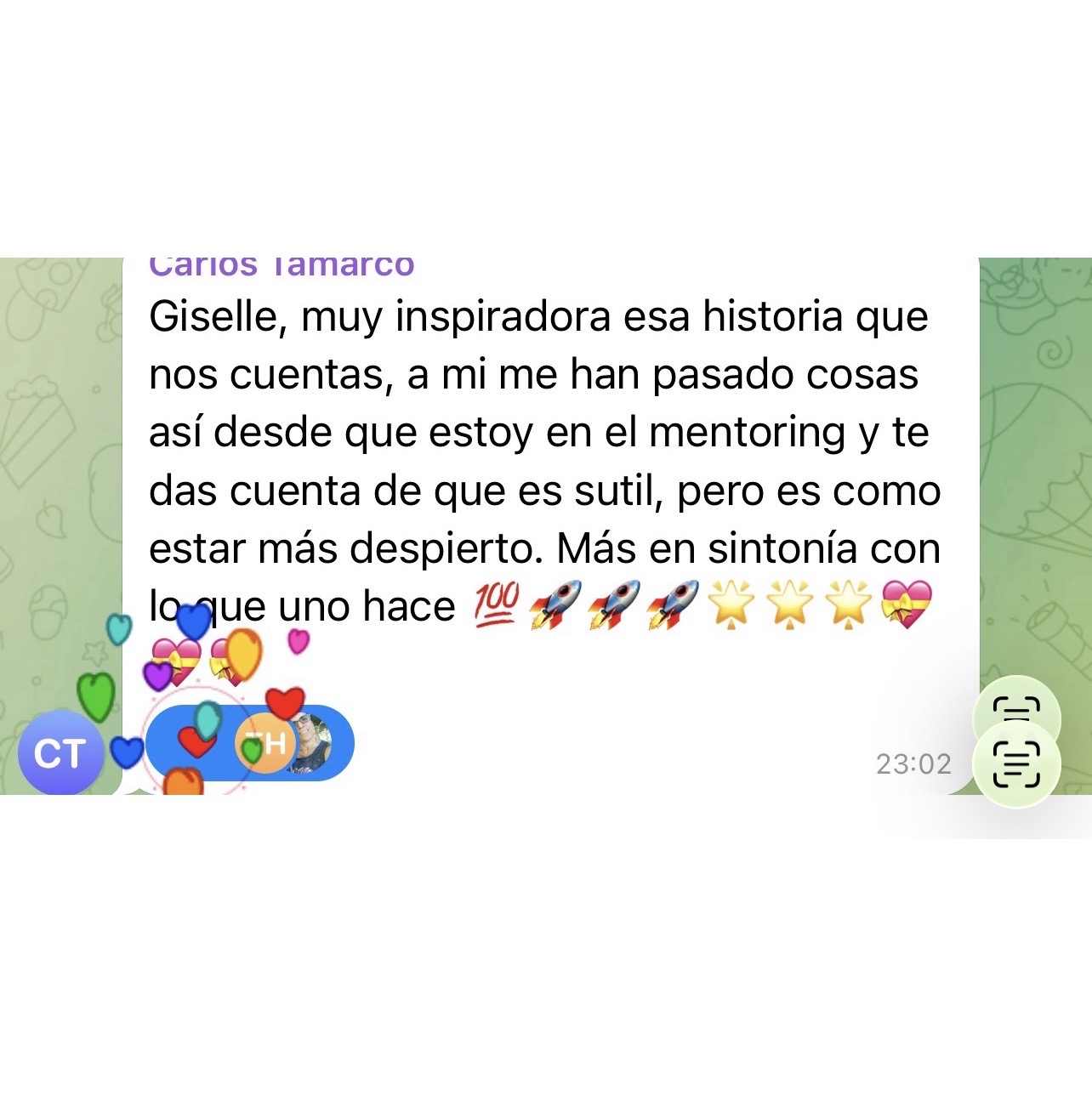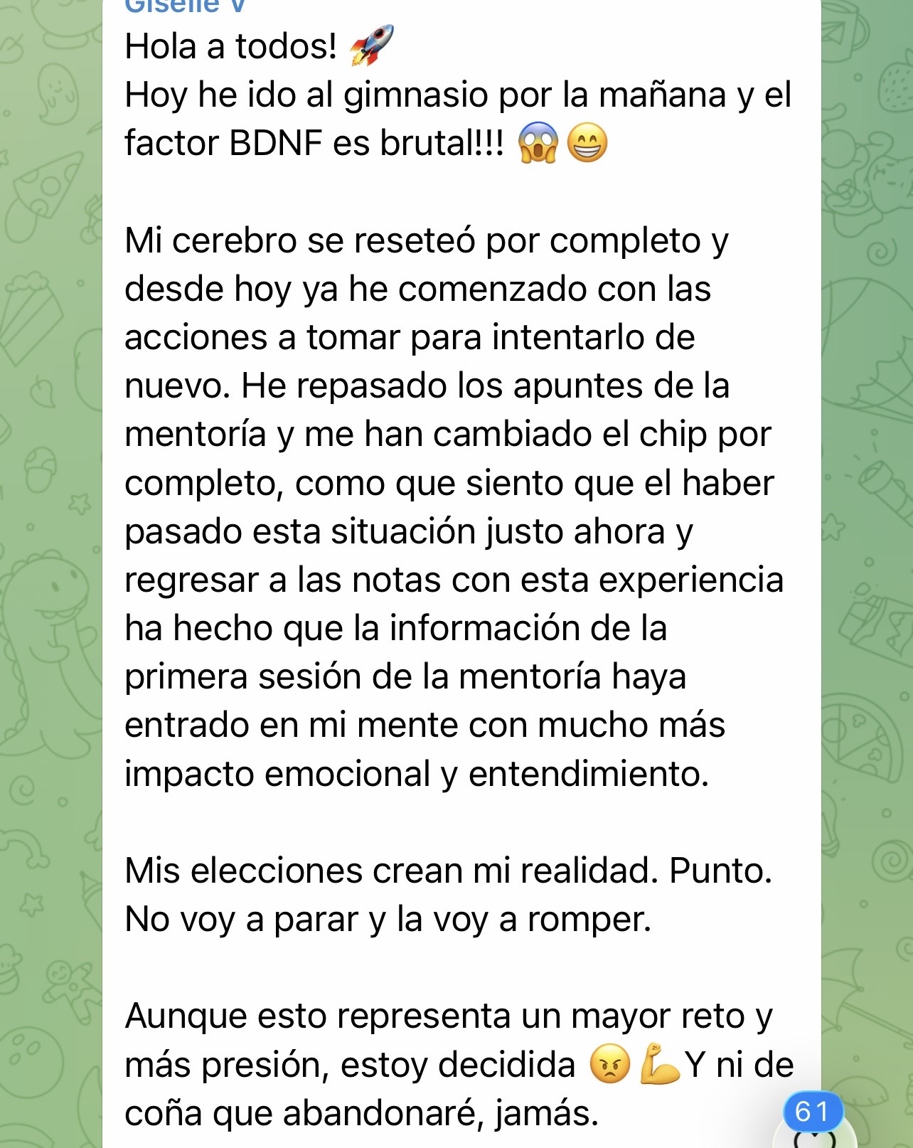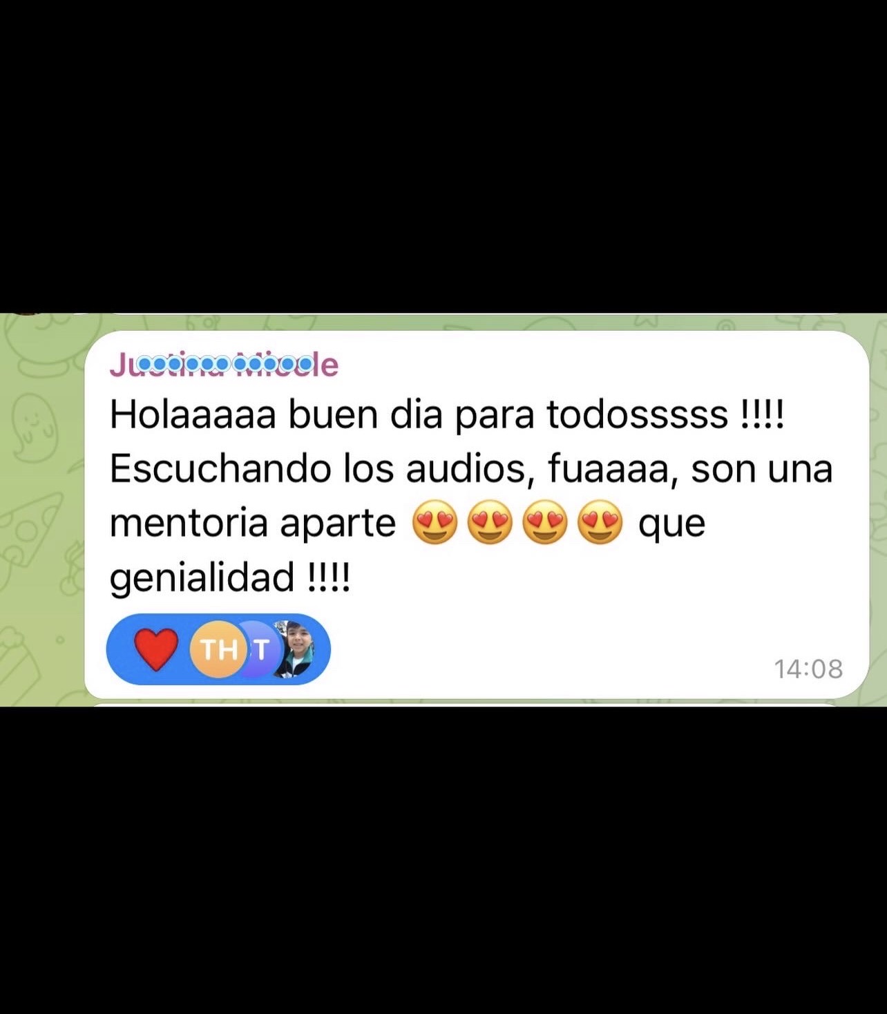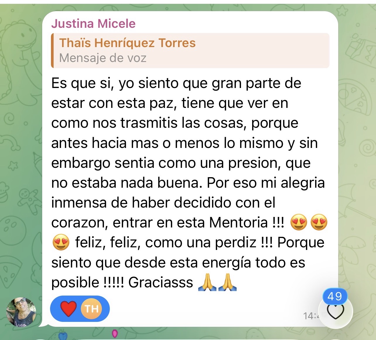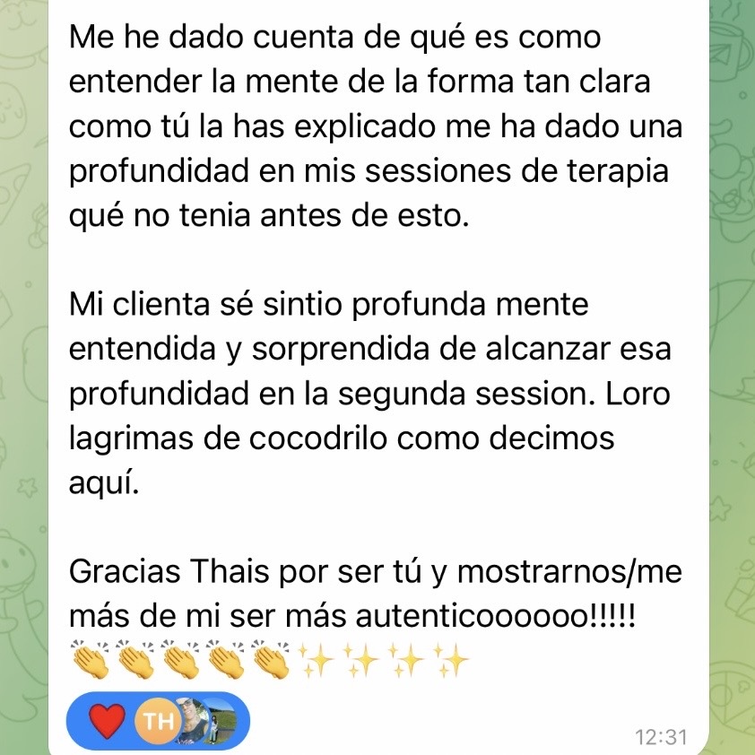 El conocimiento sin práctica se desvanece, porque tu mente necesita entrenamiento constante. Así que dentro de este grupo tendrás el privilegio de tener a tu disposición un seguimiento diario. Este espacio será tu gimnasio mental. En él Thaïs enviará audios respondiendo todas las dudas y preguntas que los alumnos tengan tanto en su día a día, como las que les surja de las reuniones vía zoom. He comprobado tras mi experiencia Olímpica que el poder del Equipo crea una energia y dirección muy potentes. Y va a ser un grandísimo impulso en tu camino. No estarás solo en tu día a día.